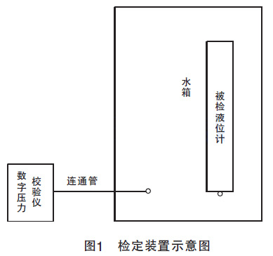 該檢定裝置如圖1所示,包括數字壓力校驗儀、水箱、連通管、水箱、各種液位計接口和固定裝置。