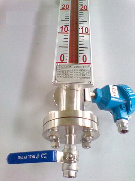 磁翻板液位計測量液體時采用頂裝或旁通管側裝方式。磁翻柱主體外加裝翻柱液位指示器、液位開關及液位變送器。磁單元置于浮球內部或通過頂桿與浮球相連,當浮球連帶磁單 元隨液位變化時,使磁性色塊(磁翻板)翻轉;磁性液位開關在對應液位點動作;同時液位傳感器在浮球磁力的作用下,輸出標準的變化電阻信號,再經過變送器把電阻信號轉換 成4~20mA電流信號輸出。