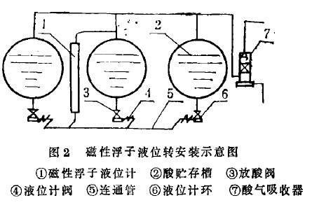 我廠頂裝式磁翻板液位計(jì)安裝,采用圖2的形式。三臺酸貯存槽②(三臺以上也可以)合用一臺液位計(jì),每臺酸槽的出口與液位計(jì),共連在一根連通管上⑤。要看某酸槽液位,開該酸槽通液位計(jì)的閥門④,液位即可醒目顯示。如此布置能節(jié)省兩臺液位計(jì),價值四千余元(酸貯存槽數(shù)量越多,節(jié)約效果越大)。此外,在安裝時要注意:裝大浮子時重端向上;裝液位標(biāo)計(jì)(小浮標(biāo))時,紅色端向上,這樣可防止磁性相斥。裝完后用備用磁鋼,將小浮標(biāo)引到大浮子磁性材料處,顯示即可正常。目前頂裝式磁翻板液位計(jì)在我廠應(yīng)用情況良好。