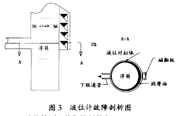 持續(xù)向空貯罐加油至液位計(jì)指示值37%時(shí),用時(shí)約15min。反之,排油液位計(jì)回零用時(shí)大于40min。在其它區(qū)域液位變化則快許多。通過(guò)對(duì)粗苯防爆液位計(jì)結(jié)構(gòu)分析,我們發(fā)現(xiàn):圓柱體浮筒(~58mm×280mm)浮在0% ~37%區(qū)間時(shí),形同一個(gè)柱塞擋住了液位計(jì)簡(jiǎn)體下部的聯(lián)通管管口(見(jiàn)圖3,