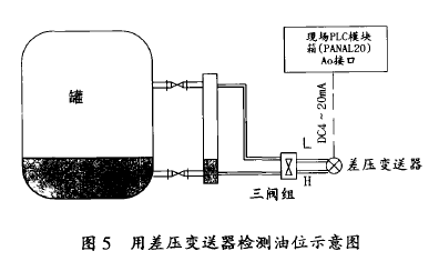 用差壓法檢測(cè)油位(△P=p•h)。在上、下聯(lián)通管處開(kāi)孔取壓,選用智能差壓變送器(*大測(cè)量范圍0~10kPa,耐壓力1.6 a,輸出DC 4~20mA,帶顯示表)檢測(cè)差壓。標(biāo)定時(shí),取工作用油壓力0~750ram油柱(為保證p值不變)作為輸入,并使表頭指示為0%~100%(線性關(guān)系)即可。差壓變送器輸出信號(hào)接入現(xiàn)場(chǎng)PLC模塊箱PANAL20的模擬量輸入通道,與軋線計(jì)算機(jī)聯(lián)網(wǎng)(見(jiàn)圖5)。
