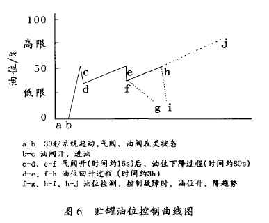 編程實(shí)現(xiàn)計(jì)算機(jī)畫(huà)面實(shí)時(shí)顯示油位(0% ~100%)和油位高、低的報(bào)警功能。我們用差壓法測(cè)量貯罐油位,如圖6所示,開(kāi)氣閥時(shí),油位回落較快;關(guān)氣閥時(shí),油位上升緩慢(每小時(shí)7%)。可以將工作油位高位設(shè)在65%,油位從該點(diǎn)升至*限高位(80%),用時(shí)估計(jì)為2h。工作油位低位在55%~60%處,預(yù)警時(shí)間將提前20s以上,工作控制油位整體提高也利于潤(rùn)滑設(shè)備的安全。因此,設(shè)定油位低于60%作為關(guān)閉氣閥條件,高于65%作為打開(kāi)氣閥條件,用雙位式調(diào)節(jié)法代替原來(lái)的延時(shí)選通位式調(diào)節(jié),控制油位在一定范圍內(nèi)。保留了原有油位故障處理程序。