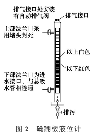 三、磁浮球液位計(jì)替換壓力變送器的技改針對壓力變送器測量尾水管水位時(shí),測量值產(chǎn)生誤差的缺陷,對壓力變送器的動(dòng)作條件以及現(xiàn)場的實(shí)際情況進(jìn)行了初步分析,認(rèn)為利用連通器的原理,在總吸水管上面安裝一套浮子式的水位開關(guān),這樣既能直觀地反映實(shí)時(shí)水位,又能保證水泵的安全、可靠運(yùn)行,浮子開關(guān)的位置可以根據(jù)實(shí)際的工作水位進(jìn)行布置,利用浮子的開關(guān)量去控制水泵的正常啟停。經(jīng)查找多方面的資料以及咨詢相關(guān)設(shè)備的廠家后,決定對檢修排水系統(tǒng)增加一套水位測量裝置,具體方案為:在水泵的總吸水管上面安裝一套磁浮球液位計(jì),如圖2所示。