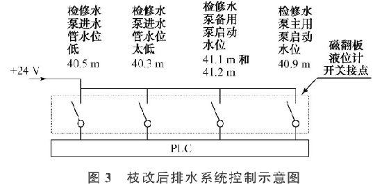 它結(jié)構(gòu)是利用旁通管的原理,主導(dǎo)管內(nèi)的液位和尾水管內(nèi)的液位高度一致,根據(jù)阿基米德定理,磁性浮子在液體中產(chǎn)生的浮力和重力平衡,當(dāng)尾水管中的水位升降時(shí),液位計(jì)主導(dǎo)管內(nèi)的浮子也隨之升降,浮子內(nèi)的永久磁鐵通過磁耦合驅(qū)動(dòng)指示器內(nèi)的翻板指示器,當(dāng)液位上升或下降時(shí),翻板指示器由白色翻轉(zhuǎn)為紅色,或由原來的紅色翻轉(zhuǎn)為白色,指示器的顏色改變的高度就是被測水位的實(shí)際高度,從而實(shí)現(xiàn)液位的現(xiàn)場指示,以供運(yùn)行人員目測尾水管的實(shí)時(shí)水位。安裝于液位計(jì)管壁外側(cè)的磁記憶開關(guān),可多點(diǎn)設(shè)置、滑動(dòng)調(diào)整位置,提供了液位開關(guān)量報(bào)警功能。在裝置的頂部安裝了一個(gè)自動(dòng)排氣裝置,當(dāng)主導(dǎo)管內(nèi)液位上升時(shí)能夠自動(dòng)的排氣,下降時(shí)能夠按時(shí)補(bǔ)氣?,F(xiàn)場安裝磁浮球液位計(jì)時(shí),裝置標(biāo)尺的0位,對應(yīng)的實(shí)地高程為EL.40.0 m。浮子開關(guān)設(shè)定5個(gè)水位動(dòng)作值,檢修水位低開關(guān)量報(bào)警值對應(yīng)的高程為40.3 m;停止所有檢修水泵的開關(guān)量,所對應(yīng)的高程為40.5 m;啟動(dòng)主用檢修水泵的開關(guān)量,所對應(yīng)的高程為40.9 m;啟動(dòng)檢修水泵主用泵的開關(guān)量,以及要求手動(dòng)啟動(dòng)大泵,并作為水位高報(bào)警上送上位機(jī),所對應(yīng)的高程為41.1 m與41.2 m,兩個(gè)開關(guān)量并列接入。全部開關(guān)量分別送入PLC,如圖3所示。