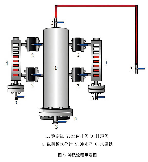 (2)拆下永磁鐵關(guān)閉4個(gè)水位計(jì)閥,打開(kāi)穩(wěn)定缸上、下閥及閥門(mén)5,單獨(dú)沖洗主穩(wěn)定缸。