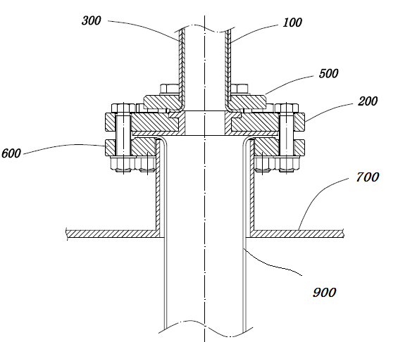 針對傳統頂裝式污水液位計的這些弊端,在多次試驗的基礎上,對現有的內襯工藝與結構做了改進,發明了頂裝式污水液位計的一種新工藝及其結構,如下圖所示,其提供了*一連接件和連接內襯。該連接內襯具有用于連通內襯連接口的*一連接口、自*一連接口向外成環形設置的*一密封部、用于與被測容器連通的*二連接口和自*二連接口向外成環形設置的*二密封部。由于該*一連接件和連接內襯為單獨設置,可以單獨制造,因此*一密封部和*二密封部可以制作的足夠大,從而實現*一密封部與浮筒內襯的翻折部密封抵接;同時,連接內襯的*二密封部用于與容器實現密封連接。由此,該連接內襯可以與浮筒內襯和容器開口內的護筒形成完全密封的連接,從而避免連接處的金屬面受腐蝕,使生產安全順利地進行,免受因發生生產安全事故對生命和財產造成的安全威脅。
