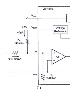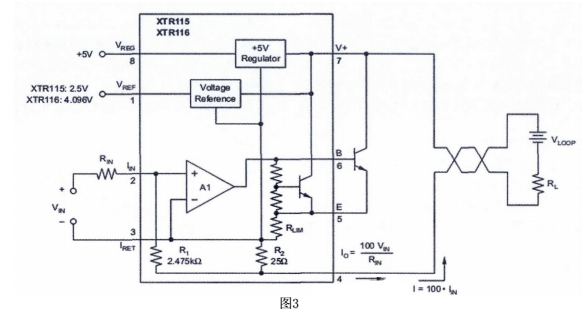 把傳感器輸出的不同電壓轉換成標準的4-20ma輸出,可采用不同的電路形式。成本低的可采用分立器件,但是為了達到比較高的精度,要保證相應器件的匹配程度,調試也比較麻煩。TI公司推出的XTR 系列工業傳感器專用的4-20ma的一體化變送器集成電路,采用該系列產品設計的變送器成本低,精度高,調試簡單。經過選擇決定使用XTR115完成設計。內部結構如圖三:
