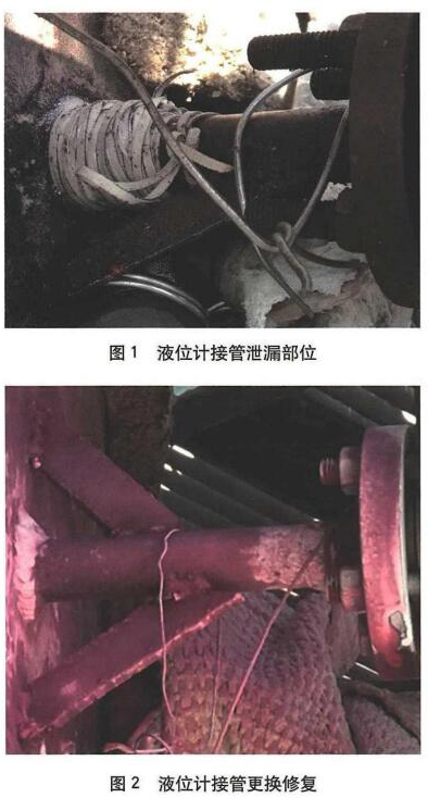圖1是分離罐液位計接管泄漏部位,圖2則是停工搶修更換并經檢查合格的襯四氟磁翻板液位計接管。泄漏發生在襯四氟磁翻板液位計接管靠近罐體部位(臨時用白色膠帶纏繞處),修復后的襯四氟磁翻板液位計接管仍釆用原設計結構,但接管壁厚增加,變更為必25x4mm。