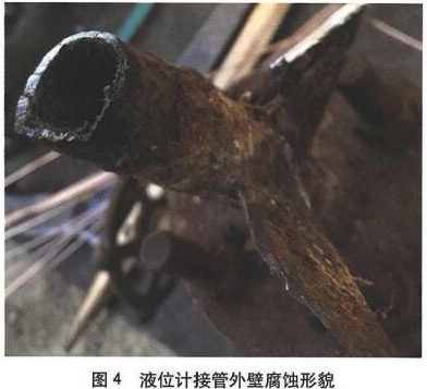分離罐液位計接管先于罐體腐蝕泄漏失效是由于管壁較薄加之外表面防腐保溫不完整導致雨水侵人常年腐蝕所致。對此應引起設計、制造、使用及檢驗等相關各方為戒。