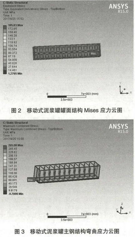 (2)考慮在使用過程中,可能出現兩個滿載的相同泥漿罐疊放的*端工況,因此底部泥漿罐在滿載的情況下還要承受上部相同尺寸的滿載泥漿罐的自重。將上部滿載泥漿罐的自重等效為加載在下部泥漿罐頂結構的均布壓力其中,見為滿載泥漿槽自重,識=168782x9.81=1655752為儲存罐頂部方管的長度乂=29.丨8111。因此/^56.8犯11?。