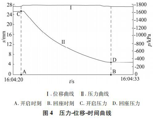 運用安全閥冷態試驗裝置對該苯酚液位計進行動作性能試驗,將試驗容器內的介質壓力卸放到整定壓力以下,開啟試驗容器和安全閥進口端的球閥,關閉流量計管路閥門,開啟主測試管路截止閥,開啟儲氣容器通向試驗容器的節流閥,逐漸加壓,同時啟動計算機數據采集系統,被試安全閥開啟,繼續升高壓力,直至被試安全閥保持全開啟( 排放) 狀態,然后關閉儲氣容器通向試驗容器的閥門,被試安全閥亦逐漸關閉。計算機自動生成試驗過程的壓力、位移曲線,試驗人員記錄采集開啟壓力、排放壓力、回座壓力、開啟高度等數據。重復上述試驗至少 3 次,得到相應壓力-位移-時間曲線,見圖 4。左縱坐標為位置,右縱坐標為壓力,其中上部曲線代表導閥位移,下部曲線代表壓力變化。當導閥位置發生變化,代表導閥開始開啟動作,此時的壓力為該苯酚液位計的開啟壓力,即整定壓力; 當導閥位置回到原點代表導閥已經回座,此時對應的壓力即為回座壓力。