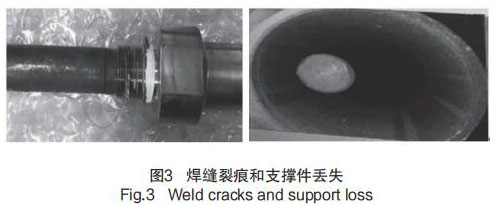 在歷次大修執行 GSS 系統 MSR 純水處理液位計預防性維修檢查時發現,部分導波桿支撐件破碎并丟失,同時存在探桿根部焊縫有裂痕的問題,見圖 3 焊縫裂痕和支撐件丟失。
