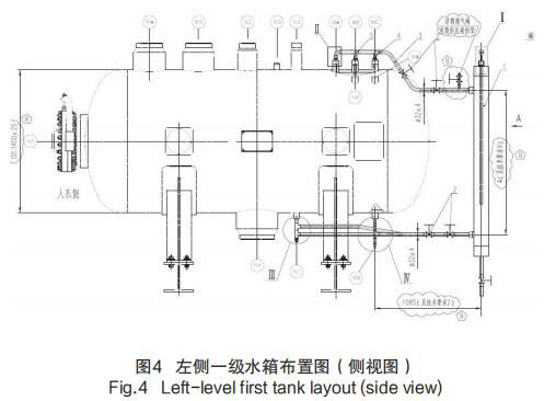 1)在每個疏水箱外部靠近水側取壓口處,安裝 3 個測量筒用于導波純水處理液位計的安置以及液位測量;每個測量筒的汽側取壓口仍然選用原導波純水處理液位計接口,而水側取壓口引用原水汽取樣口、磁翻板液位計取壓口,以左側一級水箱布置圖為例,見圖 4 左側一級水箱布置圖(側視圖)。
