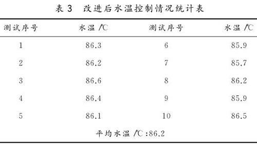 根據(jù)生產(chǎn)標(biāo)準(zhǔn)設(shè)定水溫為85℃,進(jìn)行了10次測(cè)試,平均水溫為89.2℃(見表2),超出了設(shè)定溫度4.2℃。