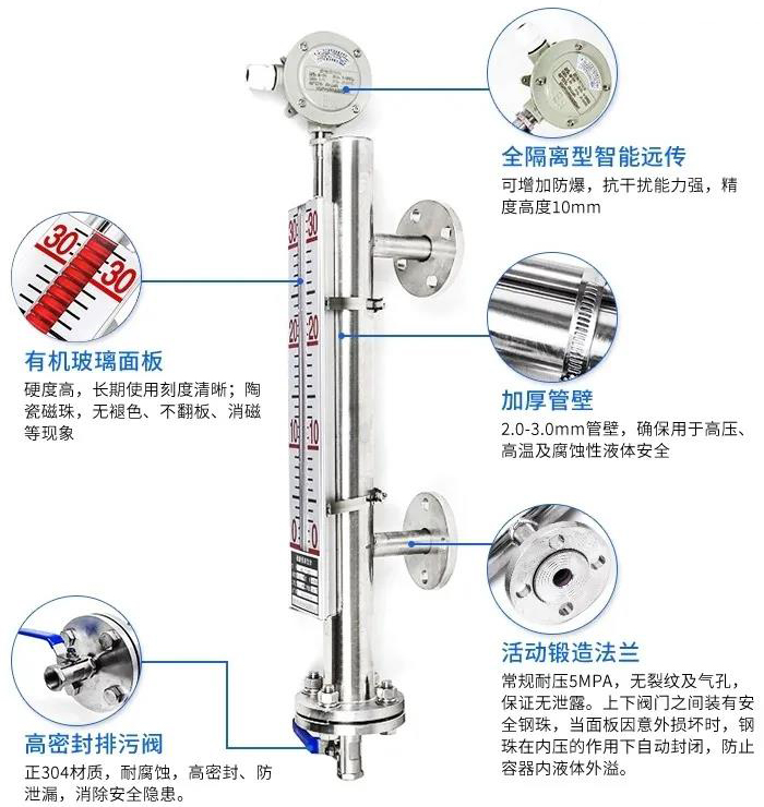 磁翻柱液位計是根據(jù)連通器和帶磁藕合基本原理而工作中的。做為一種普遍的液位儀檢測儀表,被普遍用于石油化工設(shè)備、倉儲物流運(yùn)送等制造行業(yè)對各種各樣儲槽、儲罐、球形器皿和加熱爐等機(jī)器設(shè)備內(nèi)的物質(zhì)開展液位儀檢驗(yàn)。相關(guān)磁翻柱液位計的基本原理,大家都廣為人知,但對其構(gòu)造和特性卻了解很少。那麼,磁翻柱液位計的構(gòu)造構(gòu)成和特性有什么呢?