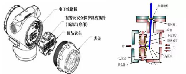 雙法蘭差壓變送器結構:主要部件為傳感器模塊、電子元件外殼、毛細管、高低壓側法蘭及膜片。傳感器模塊包括充油傳感器系統(隔離膜、充油系統和傳感器)以及傳感器電子元件。