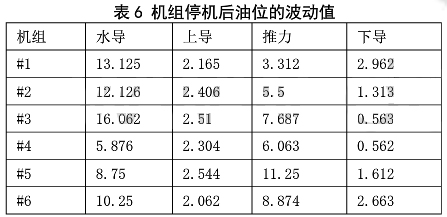 小結:在機組停機后各部軸油箱油位有波動,主要原因是油箱內部的靜態(tài)自平衡,還有傳感器的測量數(shù)值波動影響,故存在一定范圍的數(shù)據(jù)波動。6 臺機的各部軸承油位波動范圍沒有相同的規(guī)律。