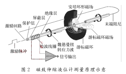 這樣的選型設計,雖然能夠滿足測量準確度的要求,但相應增加了購置成本,并且根據項目應用的實際反饋,現場存在泄漏點多、安裝與維護較復雜等問題。因此在新的伊泰杭錦旗項目中,由于項目所在地的晝夜溫差較大,冬季環境溫度*低,改用側裝3臺磁致伸縮式液位計并配磁翻柱顯示器來替代原先的差壓式測量方案。磁致伸縮式液位計主要依據磁致伸縮原理而工作,工作原理如圖2所示,由傳感器電路沿磁致伸縮線(波導絲)發出電流脈沖,在磁致伸縮線周圍形成環形磁場,當其與浮子內的永磁鐵產生的縱向磁場發生疊加時,會在浮子位置產生1個扭轉脈沖回傳至傳感器的探頭。測量起始脈沖與返回脈沖的時間差來確定浮子的位置,即液面的位置。磁致伸縮液位計具有精度高、使用壽命長、無需調零校準、易維護、安全性高等優點,但是在安裝時要注意:探測桿要保證垂直,不能折彎;做好接地屏蔽工作,以免電磁干擾影響測量效果。