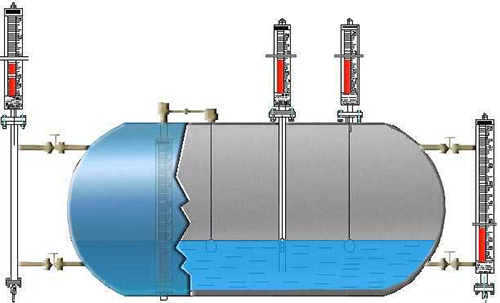 磁翻板液位計(jì)測量液體時采用頂裝或旁通管側(cè)裝方式。磁翻柱主體外加裝翻柱液位指示器、液位開關(guān)及液位變送器。磁單元置于浮球內(nèi)部或通過頂桿與浮球相連,當(dāng)浮球連帶磁單 元隨液位變化時,使磁性色塊(磁翻板)翻轉(zhuǎn);磁性液位開關(guān)在對應(yīng)液位點(diǎn)動作;同時液位傳感器在浮球磁力的作用下,輸出標(biāo)準(zhǔn)的變化電阻信號,再經(jīng)過變送器把電阻信號轉(zhuǎn)換 成4~20mA電流信號輸出。